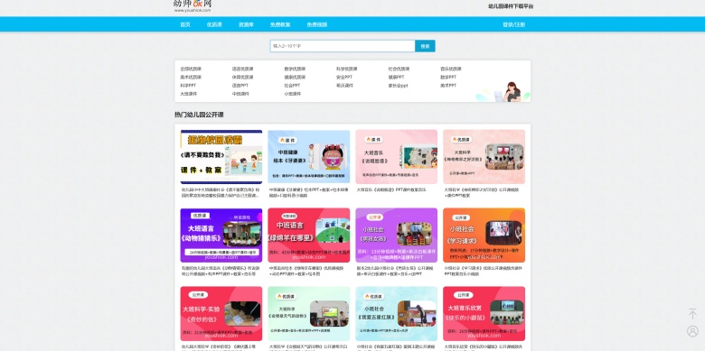 资源整合:覆盖幼儿园五大领域(健康、语言、社会、科学、艺术)及全年龄段(大/中/小班),整合优质公开课视频、PPT课件、教案模板、环创素材、家长会资料等实用内容。