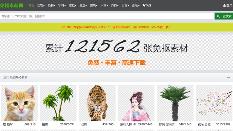 功能特点:素材均为PNG格式,自带透明背景,可直接拖入PS等设计软件使用。分辨率普遍在2000px以上,细节清晰。网站分类细致,导航栏按节日、人物、动物等场景划分,每个大分类下还有子类。支持中文关键词搜索和以图搜图功能。无需注册登录,点击图片即可右键保存,且无弹窗广告。每周更新500+新素材,紧跟热点。